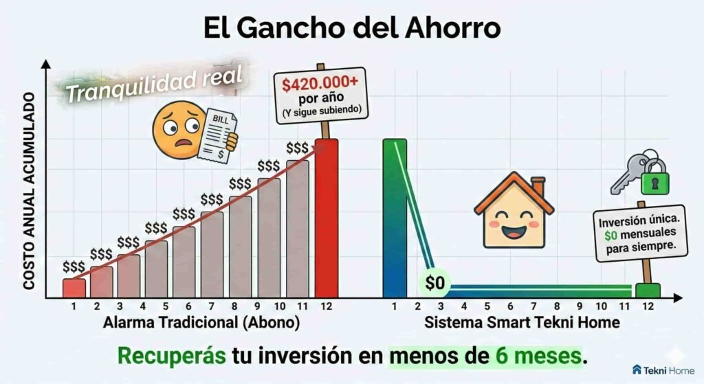 El Gancho: Si sumás lo que pagás de abono, recuperás tu inversión en seguridad inteligente en menos de 6 meses de ahorro de cuotas. A partir del mes 7, tu seguridad es “gratis”.